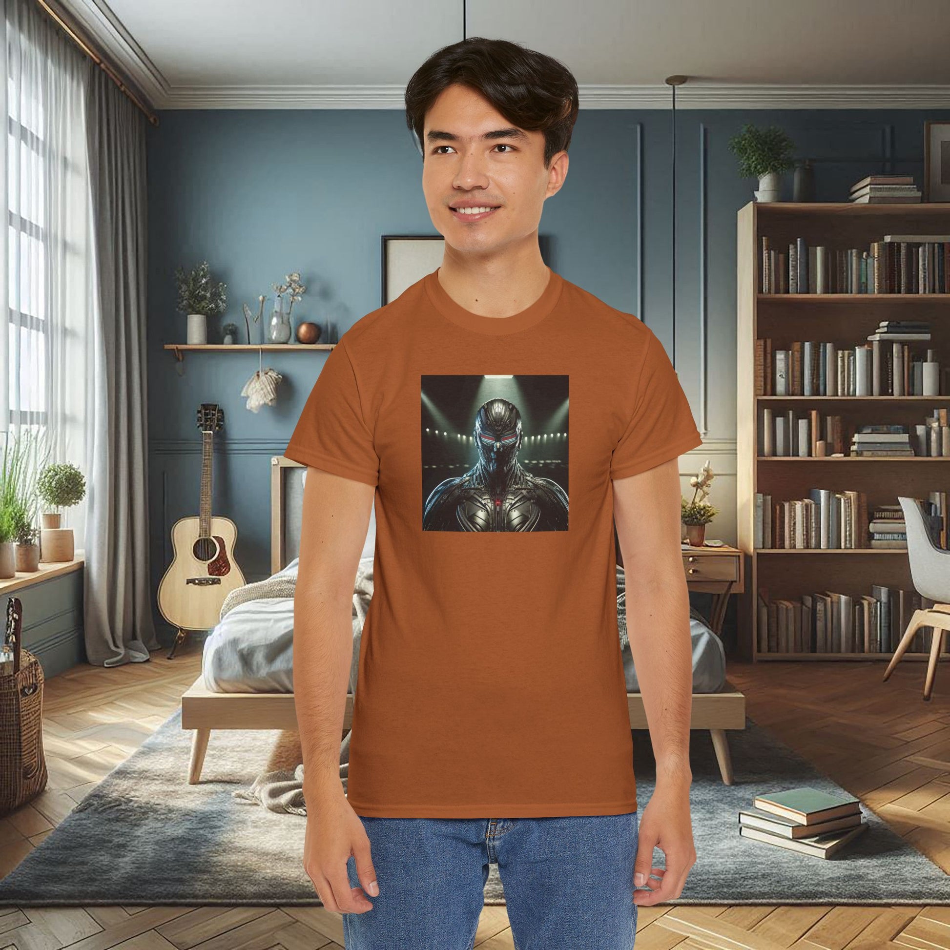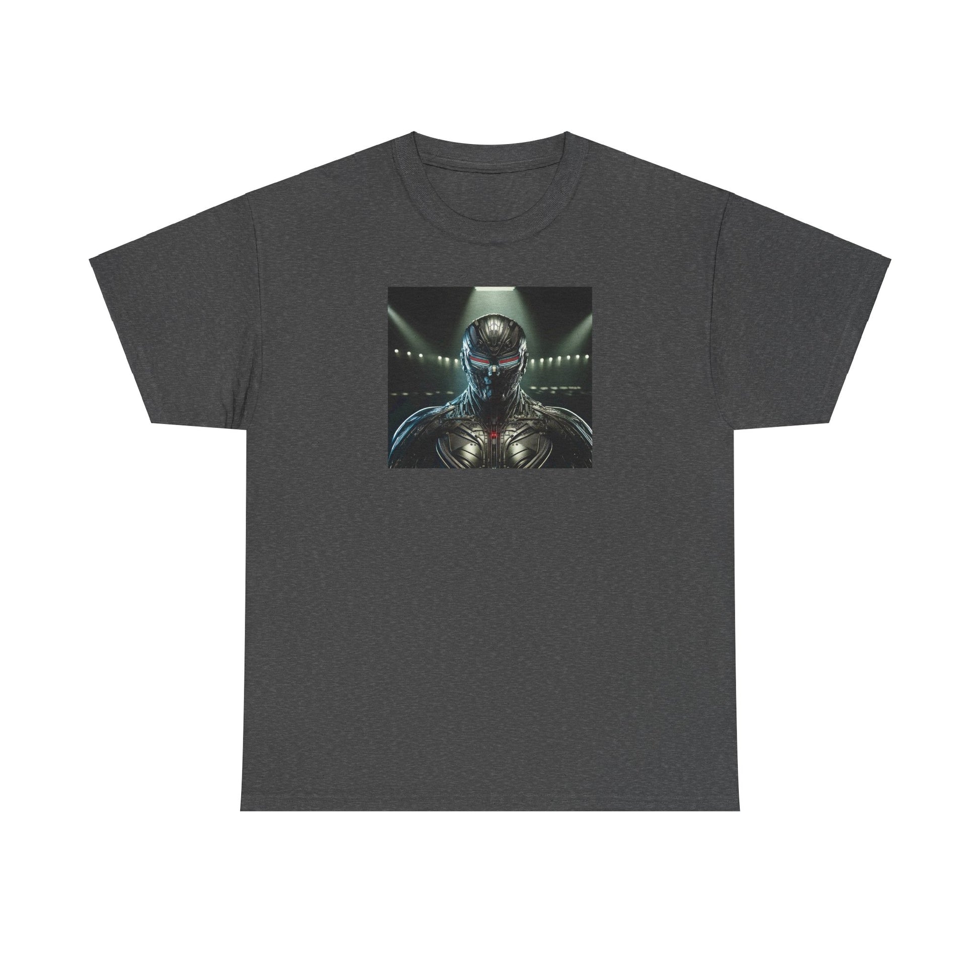 A really cool, film noir, highly detailed portrait of a cyberpunk mask. The lighting from above highlights the texture and provides shadows, giving a mysterious and edgy vibe. This T-Shirt is perfect for cyberpunk enthusiasts and those who appreciate intricate design. Ideal for wearing to sci-fi conventions, or as a statement piece for everyday wear. Product features - 100% cotton for year-round comfort - Classic fit for a comfy, relaxed wear - Ribbed knit collar for shape retention - Ethically grown and harvested US cotton - Certified by Oeko-Tex for safety and quality assurance Care instructions - Machine wash: warm (max 40C or 105F) - Non-chlorine: bleach as needed - Tumble dry: medium - Do not iron - Do not dryclean