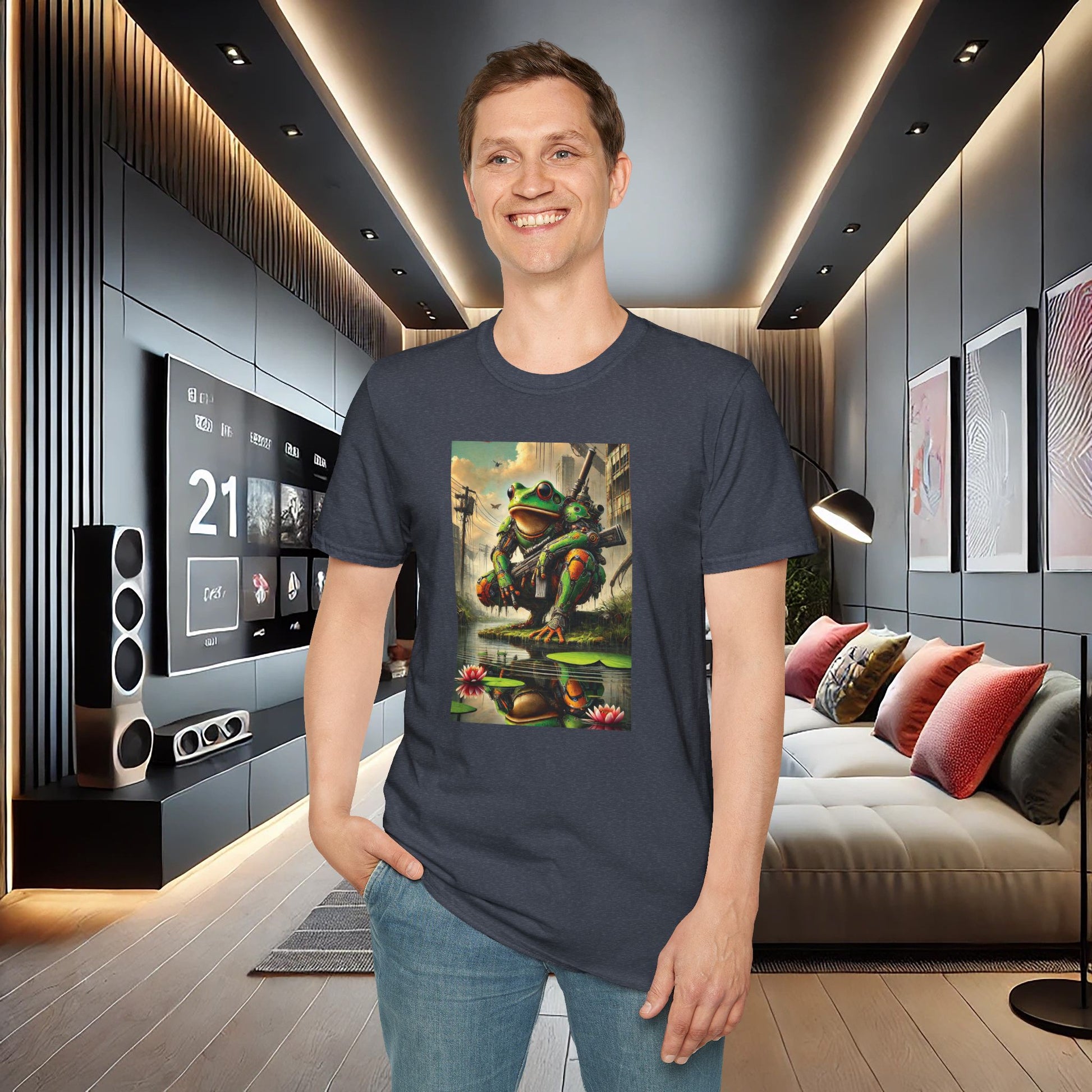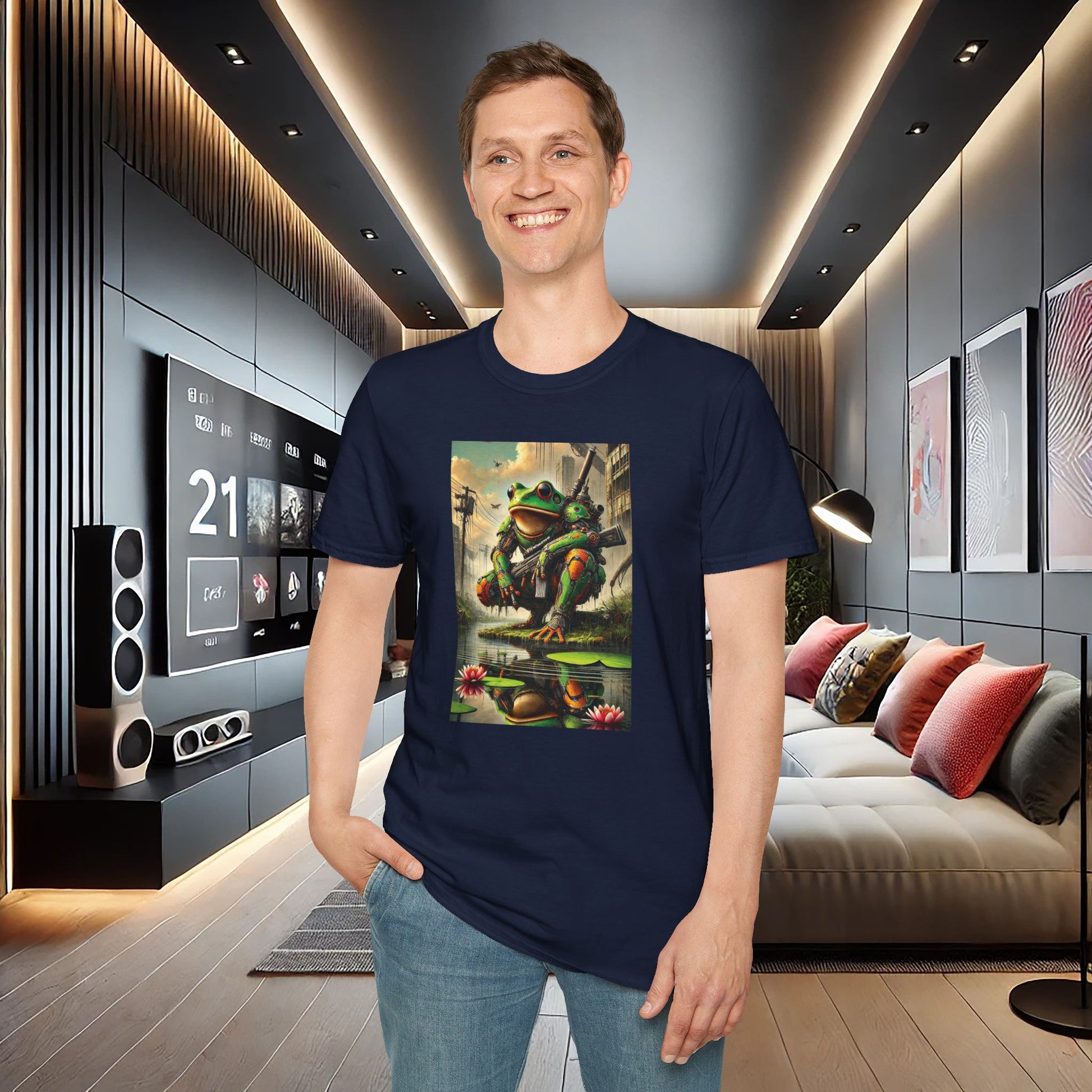 A dystopian, futuristic, cybernetic frog warrior design on a soft and comfortable unisex T-shirt. This unique design combines nature, technology, and dystopian aesthetics, perfect for fans of sci-fi and fantasy. Ideal for wearing casually or as a statement piece for a geeky or artistic look. Great for gifts for fans of cyberpunk or futuristic themes, suitable for birthdays, holidays, or comic conventions.