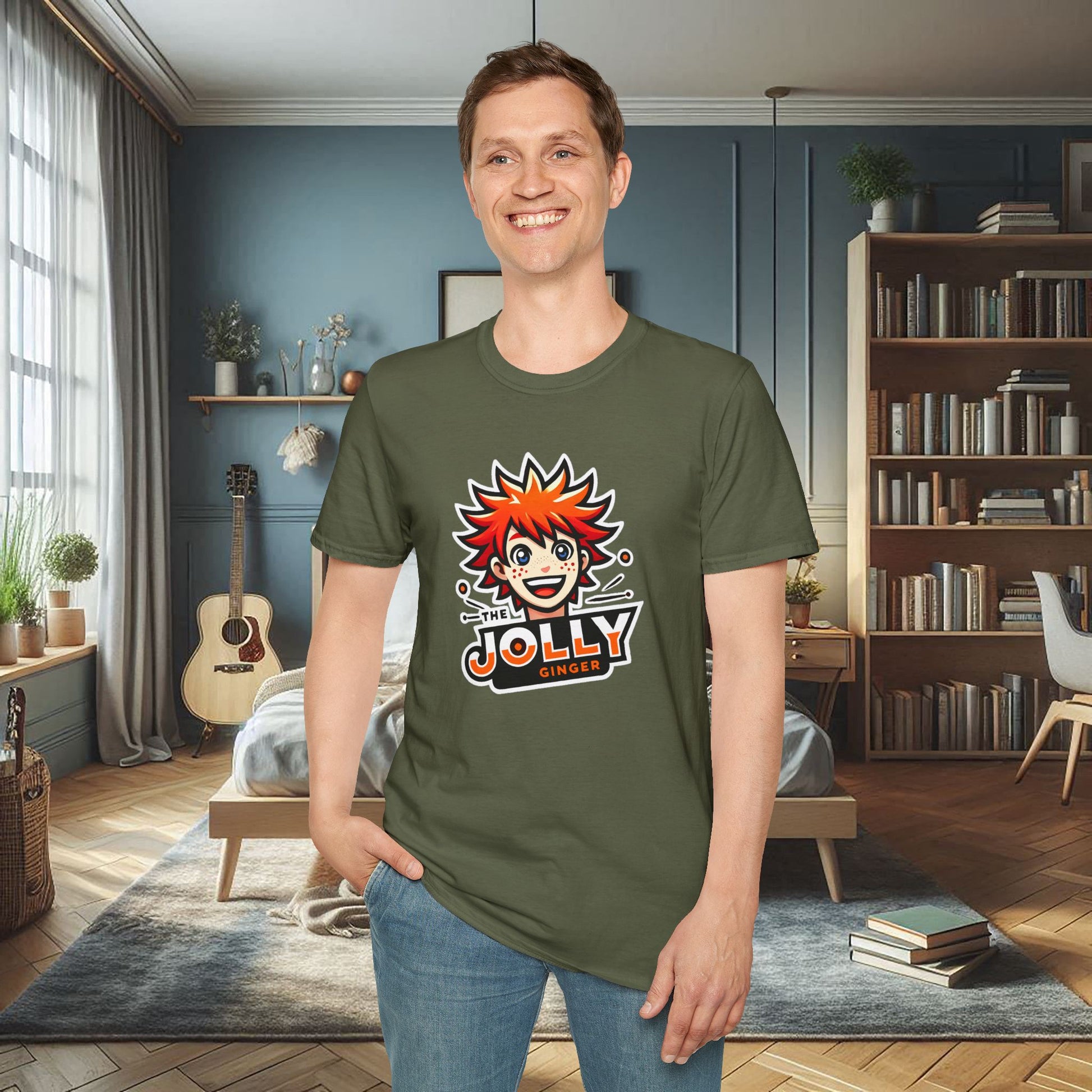 The Jolly Ginger logo t-shirt features a bright and cheerful cartoon logo with a smiling redheaded character and playful font. The overall vibe is fun, energetic, and lighthearted, perfect for those who love whimsical designs. This t-shirt is great for casual wear and can be worn during holidays and celebrations.
